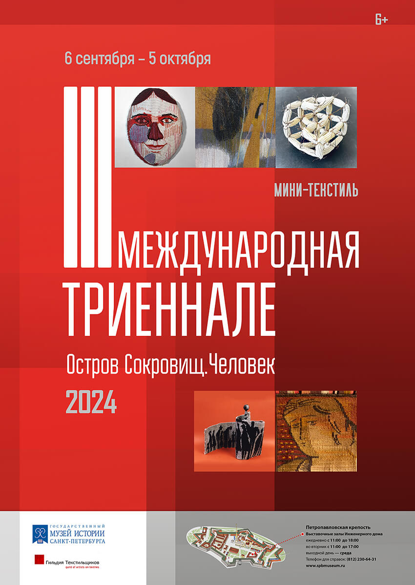 Выставочные залы Инженерного дома Петропавловской крепости (Государственный музей истории Санкт-Петербурга) гостеприимно открылись для большого зрителя. Вернисаж открытия III Международной Триеннале мини-текстиля "Остров Сокровищ – Человек" состоялся с большим количеством творческих людей, которых объединяет современное искусство. Более ста художников по текстилю из России, стран ближнего и дальнего зарубежья представили 160 авторских произведений (размер работы не более 20*20) в различных техниках волоконного искусства: гобелен, коллаж, вышивка и многое другое. Основной концептуальной идеей проекта Триеннале является создание условного "Острова Сокровищ", формируется художественное пространство с его визуальным поиском в образах представленных произведений. Затронуты такие темы, как: человек, природа, общество. В ходе проекта зрителей ждут мастер-классы по текстильным техникам и приемам, интересные встречи с художниками и знатоками текстиля. Будет проведена конференция, с обсуждением проблемы истории, сохранения и исследования художественного текстиля.